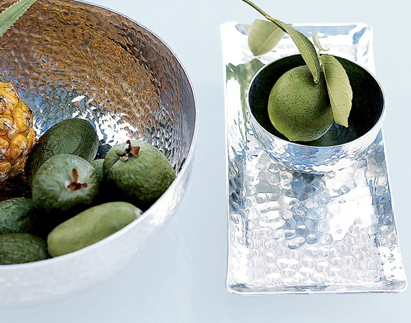 Hammered Serveware. Bowl, $24. Dip Bowl, $5. Tray, $9.