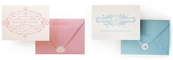 Beautiful work from Oliver Brinn. Delicately designed baby announcements with a vintage feel. Love all the flourishes lately and gorgeous scripts. The above are two of the four styles available. The announcements come with matching envelopes imprinted with return address and sticker seal. Lovely!