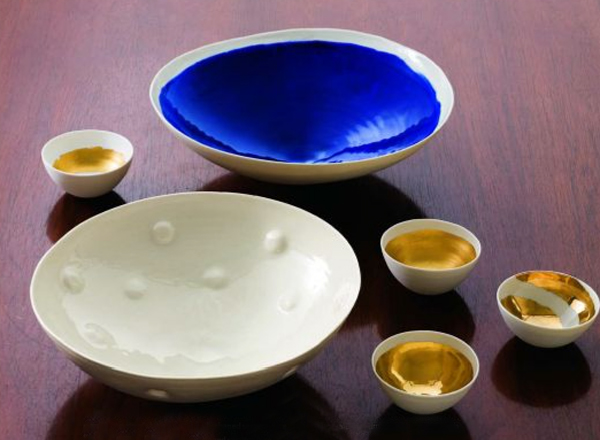 Bubbly Porcelain Potter's Bowl, $198. Glazed Porcelain Potter's Bowl, $198. Handheld Tea Bowls, various gold glazes, $28 each.