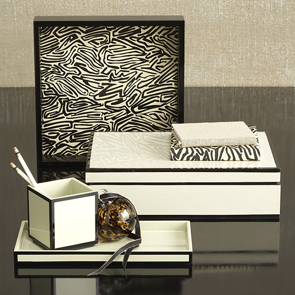 Lacquer Desk Set. Tray, $24. Low box, $39. Valet tray, $12. Pencil cup, $8.