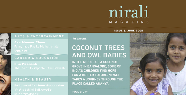 I run an online magazine with some friends called Nirali… We launched our first issue in September 2004 with a feature on the charming Kal Penn and since have covered the likes of desi newsmakers M.I.A., Shaheen Sheik, Tina Sugandh, Navi Rawat and Noureen DeWulf. We’ve been on hiatus for over a year now and are relaunching again on September 1st with a brand-new site and great content. If you’d like to introduce yourself to us, add us as a friend on MySpace!